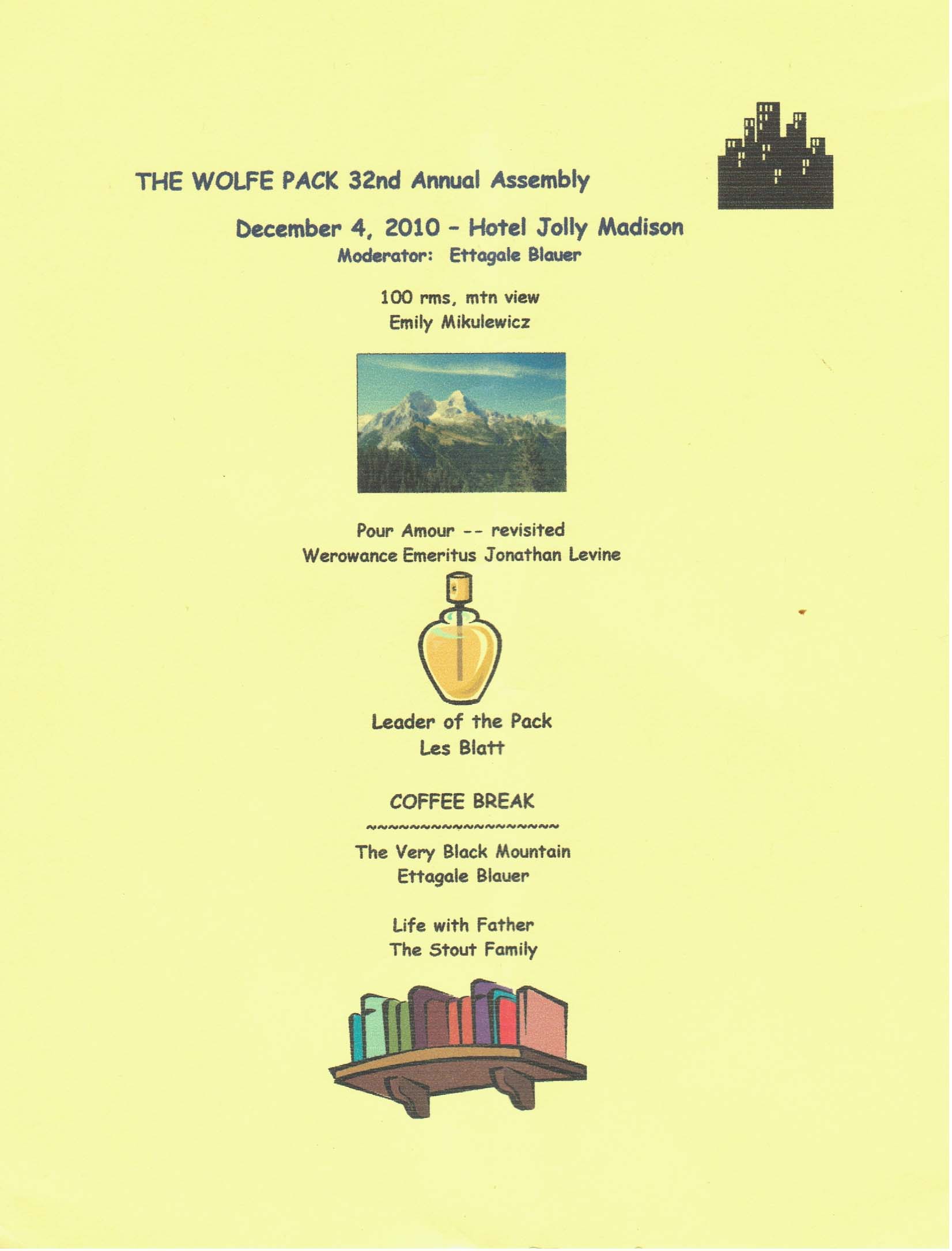 - a showing of the film short, "Ruth Stout's Garden" & a video of the Wolfe Pack's 2003 visit to Rex Stout's home in High Meadow, NY (due to frigid weather, the tentative walking tour of Rex Stout's & Archie Goodwin's Greenwich Village was postponed)